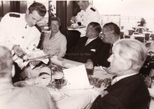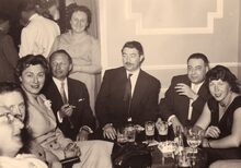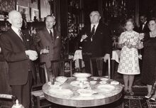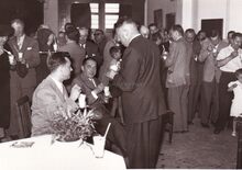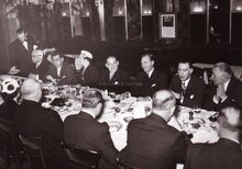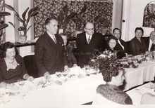 Burgemeester Adolf VAN GLABBEKE houdt een toespraak op een banket, links van hem Gilberte DEVRIENDT, rechts van hem moeder DEVRIENDT, ernaastΒ mijnheerΒ Frans DEVRIENDTΒ van de Internationale boekhandel, naast hemΒ mevrouw VAN GLABBEKE. Derde van rechts schoonzoon Georges HEILMAN .