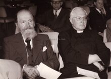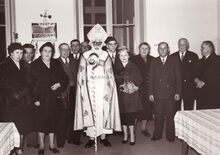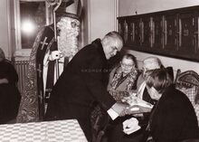 Burgemeester Adolf VAN GLABBEKE op de doop door pastoor Henri DIET, van een kind (het 9e ?) uit een kroostrijk gezin in de Sint-Antoniuskerk. Links achteraan staat deken BUTAYE. Zie ook foto 2012/0303.