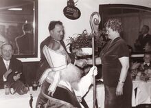 De burgemeesterΒ van Bredene,Β August PLOVIE, overhandigt een bloemstuk aan mevrouw RAMAECKERS tijdens een Sinterklaasfeestje.