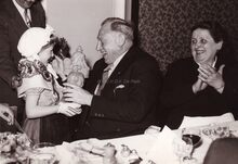 Sebastiaan BOUDOLF, socialistisch gemeenteraadslid en voorzitter OCMWΒ ontvangt op een banket een geschenk (beeldje van een paardenvisser). Naast hem zijn echtgenote Maria AELEN