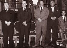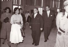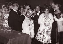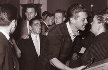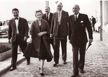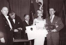 Burgemeester Adolf Van GlabbekeΒ en zijn echtgenote (2e en 3e van rechts), naast hem Georgia Moll, Italiaanse actrice,Β op de Belgische Feminaprijs van de film.Β Achter de burgemeester, Roger De RamΓ©e, directeurΒ van het Kursaal.