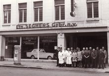 Formaat : 13 x 18 cm. - Etn. Seghers Gebr. n.v. Personeel en directie van garage SEGHERS aan de Torhoutsesteenweg 40,Β waar zich later de "Boum" bevond. Verdeler van Bedford, Oldsmobile, Chevrolet, Vauxhall. Benzinepomp van "Shell". "Eerste rij van links naar rechts : Charles Seghers (chef atelier), Wilfried Seghers (chef magazijn), Rina Vandeweghe, Marie-Louise Vanhooren, Jean (?), Maurice Knockaert, Staf Dentant. Tweede rij van links naar rechts : Cesar Seghers (garagehouder en verkoop), Raymond Seghers (opzichter atelier), Maurice Doom, Oscar Francke, (?), (?), Staf Vandenberghe, Theo Vanacker" informatie van mevrouw Marie-Louise Vanhooren via Marcel Calcoen