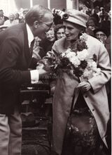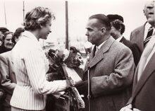 Burgemeester Adolf VAN GLABBEKE ontvangt een ruiker van een onbekende dame. Foto genomen op de Visserskaai. Achter de burgemeester een hostess van Expo 58.