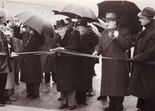 Burgemeester Adolf VAN GLABBEKE in zijn functie als lintjesknipper.Uiterst links een brandweerman die het lint vasthoudt en tweede van rechts met hoed en regenscherm gemeenteraadslid Louis VANDENDRIESSCHE.