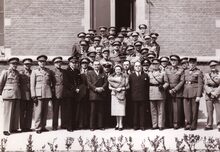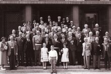 Internationaal congres van militaire dokters, deelnemers voor de ingang van het Militair Hospitaal in de Godtschalckstraat. Vijfde van rechts burgemeester Adolf VAN GLABBEKE met zijn echtgenote.