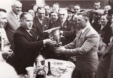Burgemeester Adolf VAN GLABBEKE overhandigt een beker aan een onbekende. Achter hem staat Maurice QUAGHEBEUR,schepen en notaris.Β