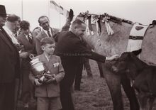 Wedstrijd voor boeren paarden op de renbaan,burgemeester Adolf VAN GLABBEKE,naast een winner, streelt de kop van een ezel.
