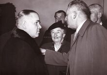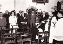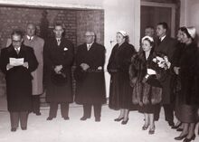 Burgemeester Adolf VAN GLABBEKE speechtΒ bij een ontvangst van de familie VAN COILLIE van de grote Oostendse aannemersfirma,achter hem staat schepen Maurice QUAGHEBEUR.Naast de burgemeester een zoon VAN COILLIE,dan J.VAN COILLIE vader en zijn echtgenote,en dan mevrouwΒ VAN GLABBEKE met bloemen,achter haar staat Jan VAN COILLIE zoon.Β