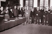 Formaat : 13 x 18 cm. - Ontvangst op het dd.stadhuis (huidig Gerechtshof) ter gelegenheid van een vaderlandse plechtigheid, Achter de tafel uiterst links, burgemeester Adolf Van GlabbekeΒ en naast hem commodore Georges Timmermans.