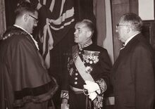 Burgemeester Adolf VAN GLABBEKE, in vol ornaat, ontvangt een Lord Mayor in het Gerechtshof (toen diensdoend stadhuis).