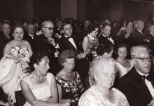 Uitreiking van de Belgische Feminaprijs voor Film 1956Β in het Kursaal. Op de derde rij van links naar rechts ,mevrouw VanΒ Glabbeke, onbekend, de Gouverneur van de provincie West-Vlaanderen Pierre van Outryve d'YdewalleΒ en zijn echtgenote,Β burgemeester Adolf Van Glabbeke,Β schepen Kamiel Dehouck. Op de vierde rij tweede van links, Marie-Jozef Porta, gemeenteraadslid. Vooraan op de eerste rij,de heer en mevrouw AimΓ© BouchΓ©-Margareta Ceunis, controleur van het kadaster.