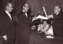 Burgemeester Adolf Van GlabbekeΒ reikt de Belgische Feminaprijs van de Film 1956Β uit aan eenΒ winnaar.