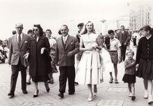 Burgemeester Adolf Van GlabbekeΒ met de Franse filmster Mylene DemongeotΒ op de Albert I Promenade tijdens de Feminaprijs voor Film 1956