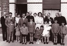 Burgemeester Adolf VAN GLABBEKE op bezoek bij een kroostrijk gezin (9 kinderen ?). Hij heeft een ereteken bij voor de prestatie.Β De pastoor, Henri DIET en deken BUTAYE, uiterst rechts, zijn ook van de partij.