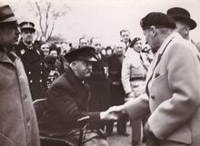 Tijdens zijn eerste bezoek aan Oostende begroet veldmaarschalk MONTGOMERY een oorlogsinvalide.Op de achtergrond rechts een lid van de gewezen Witte Brigade (verzetsorganisatie tijdens de Tweede Wereldoorlog). Links een rijkswachtofficier. Foto genomen op het Canadaplein.