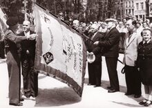 Veldmaarschalk MONTGOMERY tijdens zijn tweede bezoek aan Oostende op het Canadaplein met naast hem burgemeester Adolf VAN GLABBEKE bekijkt het vaandel van Rokersclub "De Lustige Smoorders" (!). Hij was zelf een een absoluut anti-roker.