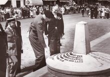 Veldmaarschalk MONTGOMERY en burgemeester Adolf VAN GLABBEKE bij het zuiltje dat bij zijn eerste bezoek aan de stad in 1948 werd geplaatst. Op de achtergrond hoek Visserskaai en Vissersplein. Op de foto herkennen we ook schepen Jan PIERS.