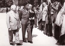 Veldmaarschalk MONTGOMERY schouwt op het Canadaplein de vaandels van de diverse oudstrijdersverenigingen. Naast hem burgemeester Adolf VAN GLABBEKE. Op de achtergrond het Leopoldpark.