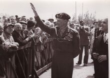 Veldmaarschalk MONTGOMERY groet het publiek op het Canadaplein tijdens zijn tweede bezoek aan Oostende. Naast hem burgemeester Adolf VAN GLABBEKE.