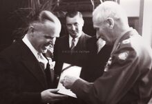 Burgemeester Adolf VAN GLABBEKE overhandigt namens de stad een geschenk aan veldmaarschalk MONTGOMERY bij zijn tweede bezoek aan Oostende.