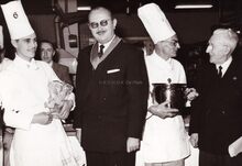 Centraal Roger De Ramée, concessionnaris Casino-Kursaal met links, de winnaar René Kobs van de kookwedstrijd Prosper Montagné ("Beste Kok van België 1960"), met een recept van schaap. Uiterst rechts, Gaston Clement. Foto genomen in de keukens van het Kursaal.