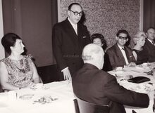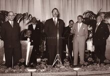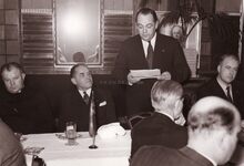 Thermae Palace Hotel. Centraal geeft Theo DEHAENE, voorzitter van de Liberale Middenstand, een speech naar aanleiding van het 15-jarig bestaan. De eerste man rechts van hem is Willy DECLERCQ. De vereniging werd in 1946 gesticht door Pierre MONTENY