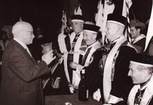 Intronisatie van de ridders van de "Confrérie van de Rat Mort". Vooraan links, Emile Bulcke, kunstschilder. Op de eerste rij, tweede van rechts, Charles Feys, brouwer (onder voorbehoud).