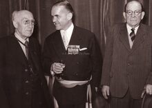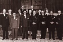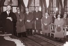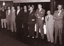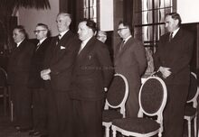 Burgemeester August Plovie van Bredene op een ontvangst op het dienstdoend Oostends Stadhuis (Gerechtshof). Hij was ook leraar lichamelijke opvoeding in het Koninklijk Atheneum van Oostende. Eerste rij, tweede links, de heer André Titeca, burgemeester van Middelkerke.
