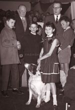 Twee leerling (?) verpleegstertjes overhandigen een geschenk,nl. een visser- en visserinpop,aan een onbekend echtpaar;Op de voorgrond staat Sebastiaan BOUDOLF,gemeenteraadslid.Foto genomen in de verpleegsterschool.