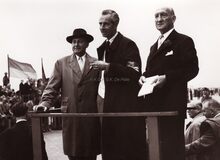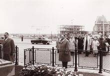 Burgemeester Adolf VAN GLABBEKE bij een huldiging (11 november ?) aan het monument der gesneuvelden van beide wereldoorlogen aan het Sint Petrus en Paulusplein.Op de rij der notabelen staat Jan PIERS toekomstig burgemeester (2e van rechts).Op de achtergrond de kantoren van het Zeewezen aan de Natiënkaai in opbouw.