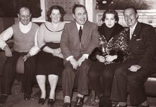 Gustaaf Smets, uitbater van "Het Witte Paard" huldigt een onbekende. Links staat John Hermans, journalist en de tweede van rechts is Henri Degrave, gemeenteraadslid