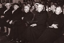 Plechtigheid in de toneelzaal van het Sint-Andreasinstituut in de Kaaistraat. Vooraan, van rechts naar links : pastoor Arsène CARRON, deken René BUTAYE en Karel MARTENS, pastoor van de Heilig Hart parochie.
