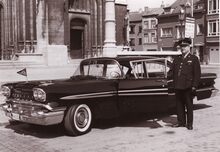 Een luxe stadswagen geparkeerd voor de Sint Petrus en Pauluskerk,de chauffeur,een brandweerman,staat er bij.Wagens van dit soort werden gebruikt om burgemeester en schepenen rond te rijden. Op de achtergrond de Strackestraat.