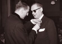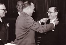 Vereremerking in de kursaal (?) van mevrouw BOGAERT en onbekende heer. Rechts Theo DEHAENE, liberaal voorman.