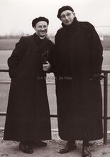 Pastoor VERHELLE (rechts) en confrater BALANCK op het Hermes atletiekstadion, thans (2012) B.L.O.S.O. Jozef VERHELLE werd priester gewijd op 10 juni 1933. Leraar College Menen, 1935. Priester-leraar OLV College, 1936. Diecteur Sint-Andreasinstituut, 1956. Stichter van Atletiekclub Hermes.