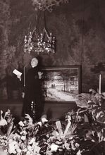Deken BUTAYE houdt een toespraak tijdens zijn viering in de Koninklijke Schouwburg. De kroonluchter en het schilderij waren geschenken. Een schilderij van kunstschilder Joris Houwen. Zie indexnummer 2011/0725