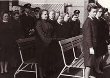 Een groep onbekende kerkelijk (?) gedecoreerden voor de ingang van de Sint Petrusen Pauluskerk.