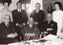 François DEVRIENDT (met krukken) uitbater van de Internationale Boekhandel op de hoek van de A.Buylstraat en de Hertstraat bij de opening van de handelszaak kantoormeubelen en -machines in de Kaaistraat nr. 3. De man in het bleke pak is de schoonzoon HEILMAN, gehuwd met Gilberte DEVRIENDT. Men verkocht er tel- en schrijfmachines, fotokopie- en duplicaatmachines, kantoormeubelen. Met tentoonstellingszaal.
