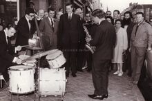 Opening "Promenade-tentoonstelling" aan de Torhoutsesteenweg, hoek Frère-Orbanstraat. Op de achtergrond rechts het Mac Leodplein. Vooraan Marcel Friedrichs, gemeenteraadslid, Jan Piers, burgemeester en achter hem Dries Claeys, volksvertegenwoordiger. Uiterst rechts Anton Diez, en naast hem Silvio Romano, beiden kunstschilders. De muziekgroep is het "Lightning Jazz Trio", met Eddy Masschalck (tenorsax), Ronny Dewulf (contrabas) en Jean-Pierre Pitteljon (drums).