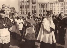 Bisschop LAMIROY (centraal op de foto) op het Sint Petrus en Paulusplein voor de grote kerk. Op de achtergrond het Zeemanshuis (Zaal El Mar) met het aquarium, er naast het cafe "Petit Bourse",links de hoek van de Pastoor Pypestraat. Capa-magnadrager is E.H. Alfons DE GROEVE (leraar OLV College). Achter DE GROEVE bemerken wij E.H. Daniël VAN PARIJS (leraar OLV College) en Lucien DEWULF (priester leraar OLV College). Rechts vooraan Monseigneur Vincent-Victor DEREERE.