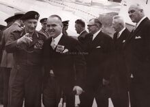 Onderonsje tussen veldmaarschalk MONTGOMERY en burgemeester Adolf VAN GLABBEKE bij zijn vertrek na het tweede bezoek aan onze stad. Op de foto ook uiterst rechts schepenen Maurice QUAGHEBEUR en Emiel VROOME.
