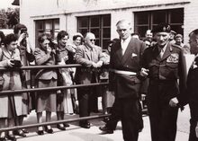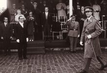 Veldmaarschalk MONTGOMERY en burgemeester Adolf VAN GLABBEKE bij zijn vertrek na het tweede bezoek aan onze stad. Rechts achter de burgemeester schepen Emiel VROOME.