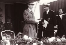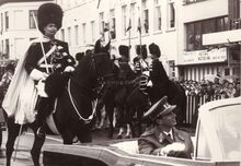 Koning Boudewijn op de Visserskaai waar het défilé van 21-07-1966 zal passeren. Hij wordt begeleid door een detachement van de Rijkswacht (mét berenmutsen).