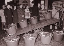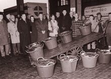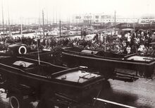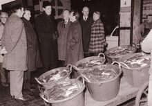 Aanvoer van vis (pladijs) in de Vismijn.Vooraan van links naar rechts : onbekend, Sylvain TYTGAT,afdelingschef Havendienst,Raf GHYS,havenkapitein,voorzitter rederscentrale,DUMAREY schepen voor de haven,zijn dochter Ginette (?),burgemeester Jan PIERS,achter deze laatste PORTA,gemeenteraadslid,de rest onbekend.