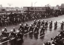 Een detachement gemotoriseerde Militaire Politie rijdt voorbij tijdens het défilé van 21-07-1966 aan de Visserskaai.