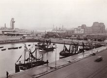 Het huidige (2012) Montgomerydok dat deze naam kreeg bij het bezoek van Montgomery in 1948,voordien was hier de Visserskreek (achteraan).Op de achtergrond het Station met nog duidelijke sporen van oorlogsschade.Links het gebouw van de car ferry's,let op de Nissenhutten die kort na W.O. II (zeer) veel gebruikt werden.