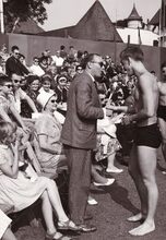 Wedstrijden in het zwembad van "Ostend Swimming Club" bij het Koninginnehof. De voorzitter, J. Elleboudt overhandigt een beker aan de kampioen.