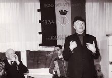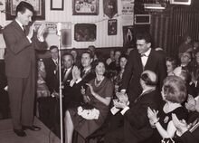 Toni CORSARI entertaint in het lokaal van biljartclub "Willen is Kunnen" en manillersclub " De Kloppers" in de Sint Sebastiaanstraat (?).Vooraan op de eerste rij de heer en mevrouw Jan PIERS (burgemeester).Zelfde foto als 2012/0182.