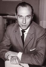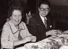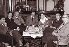 Aan het klavier Joseph Berden, ook orgelist van de Sint-Jozefskerk, tijdens een banket van het SEO-personeel in het Hotel Wellington. Achter hem Florimond Corsellis, dirigent van de stadsharmonie, en zangeres Jacqueline Monteyne. Banket naar aanleiding van de viering van bestuurder Maurice Nenquin.