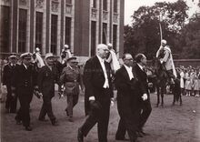Centraal vooraan stadssecretaris Michel SURMONT, burgemeester Henri SERRUYS, schepen Louis VANDENDRIESSCHE, vertrekkend uit het Gerechtshof, toen dienstdoend als stadhuis. De ruiters op de achergrond zijn Spahis (Noord Afrikaanse ruiters van het Franse leger,afkomstig uit Algerië, Marokko en Tunesië).Foto op het Canadaplein.